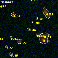 Object #87 x,y = (2900, 3419) RA, Dec = (00:32:09.576, 18:08:48.12) = (8.03990, 18.14670) BPZ = 4.997 [4.640--5.233] type = 10.20 (SB3_B10 - SB11_A_0_l) chisq2 = 0.18 ODDS = 0.83 z_cluster = 0.396