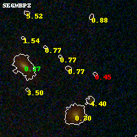 Object #99 x,y = (2572, 3402) RA, Dec = (00:32:10.944, 18:08:47.04) = (8.04560, 18.14640) BPZ = 0.771 [0.226--4.416] type = 8.50 (SB2_B10 - SB1_B10) chisq2 = 0.93 ODDS = 0.14 z_cluster = 0.396