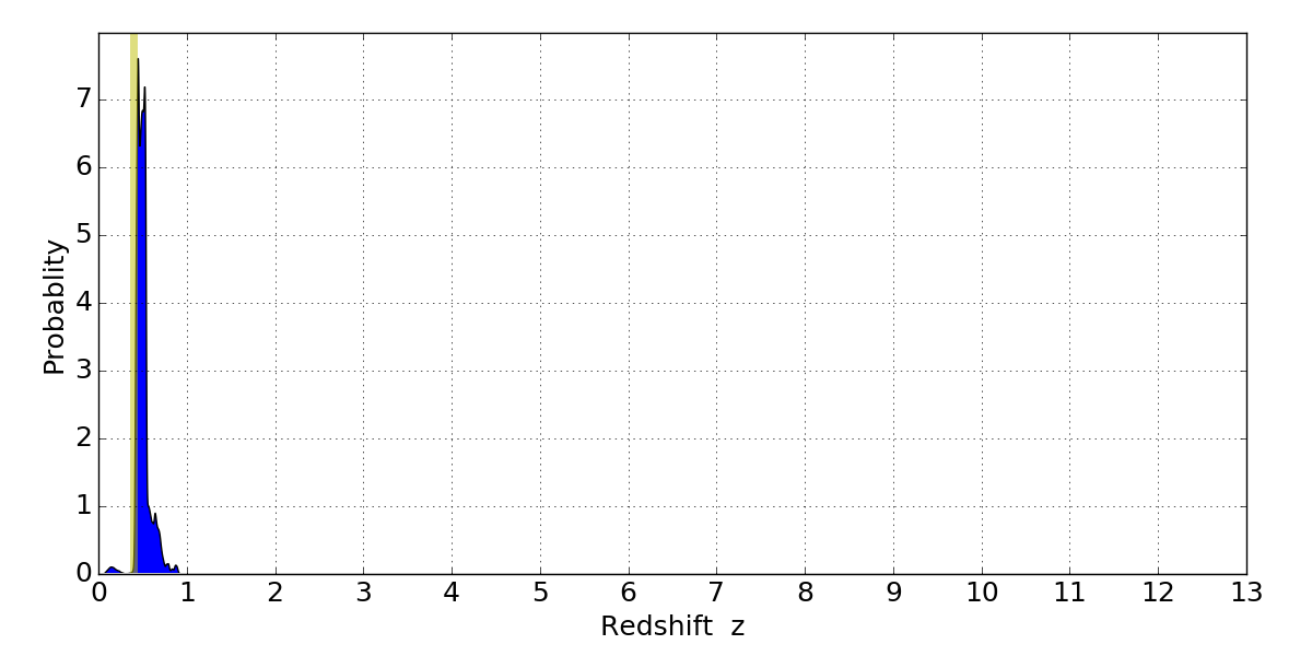 In P(z) plots: Yellow lines mark the cluster redshift z = 0.396,