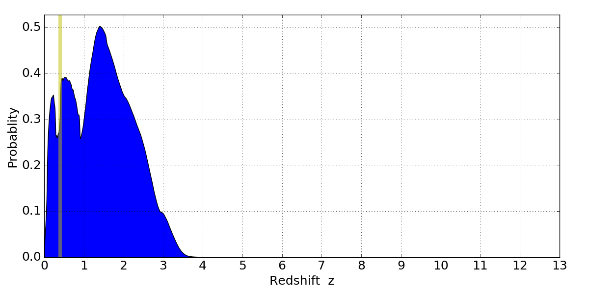 In P(z) plots: Yellow lines mark the cluster redshift z = 0.396,