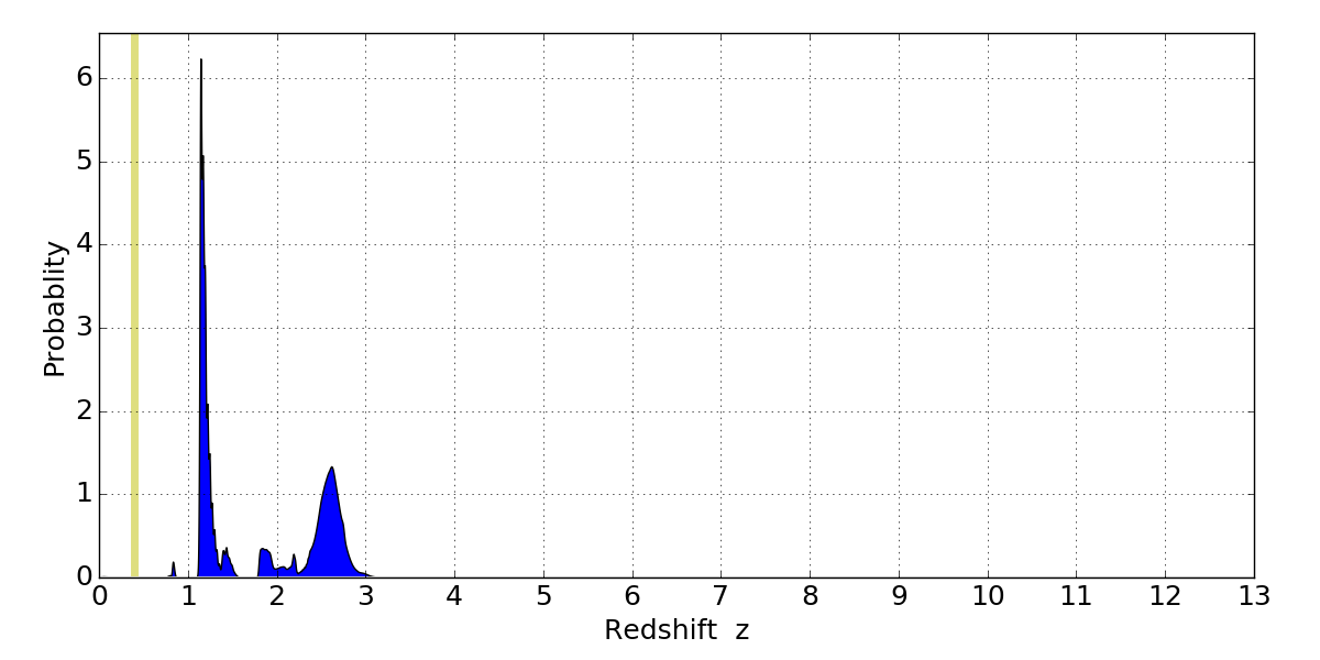 In P(z) plots: Yellow lines mark the cluster redshift z = 0.396,