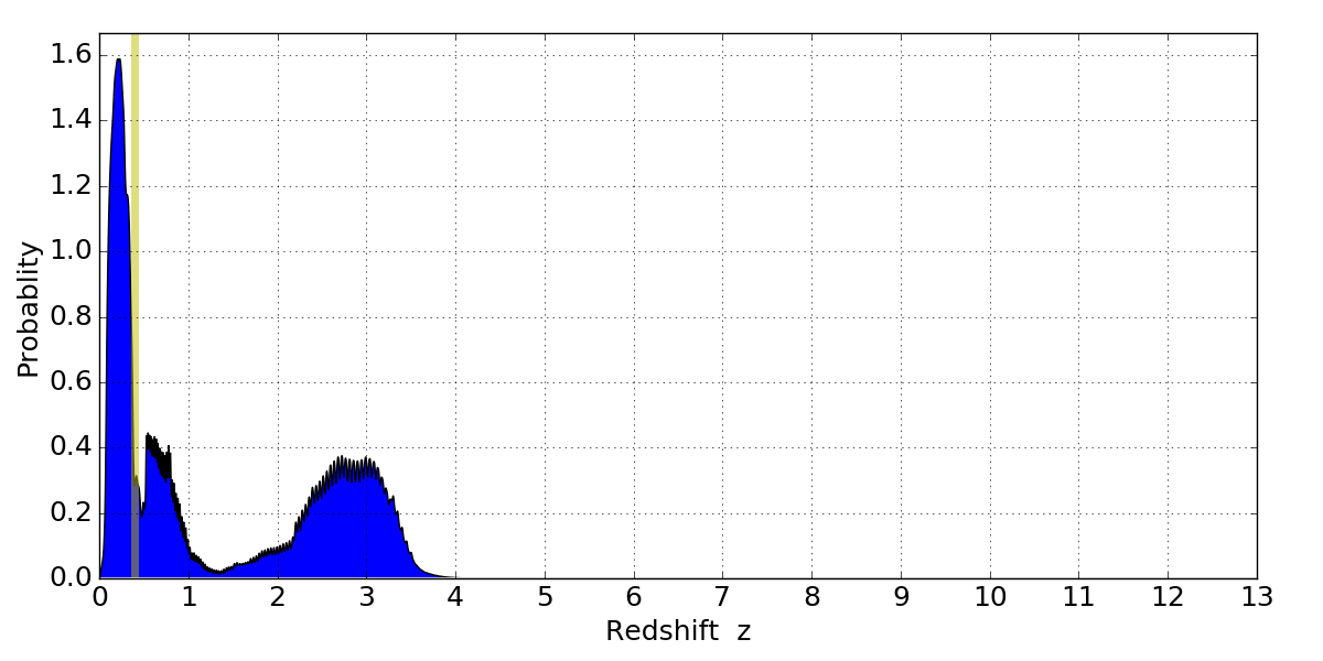 In P(z) plots: Yellow lines mark the cluster redshift z = 0.396,