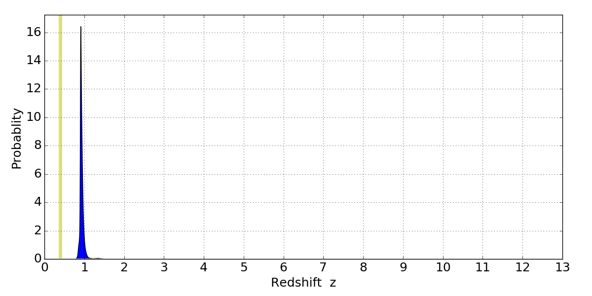 In P(z) plots: Yellow lines mark the cluster redshift z = 0.396,