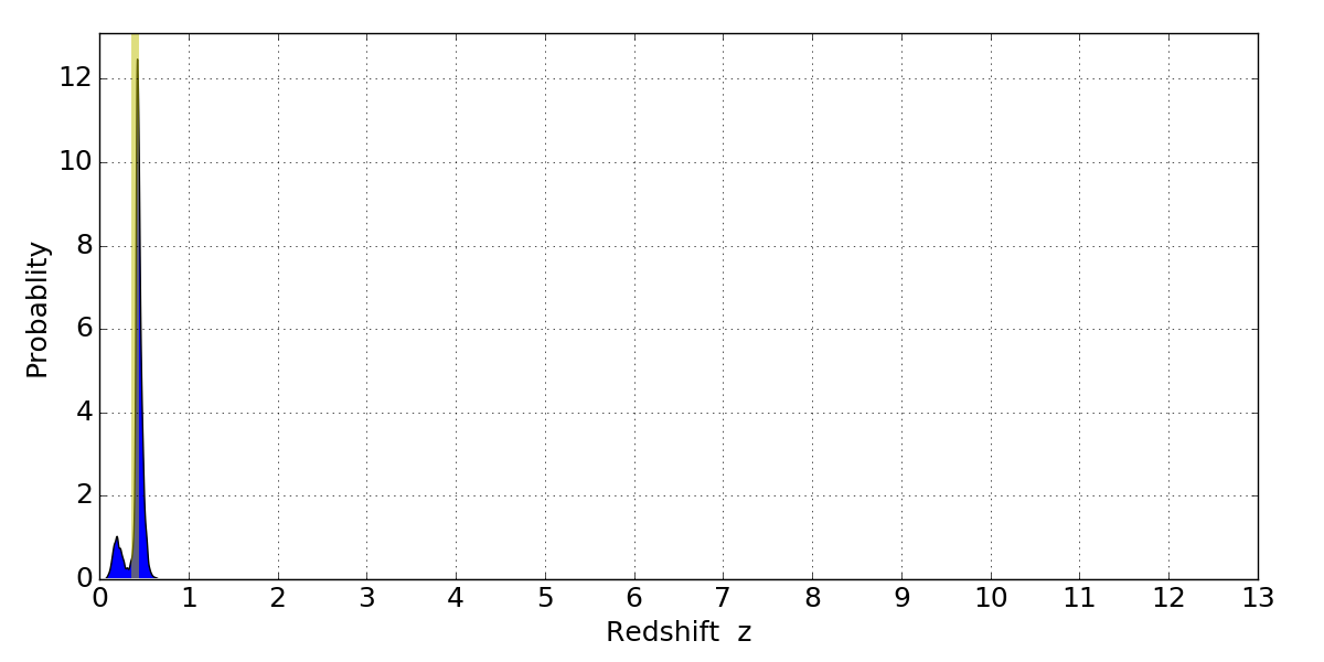 In P(z) plots: Yellow lines mark the cluster redshift z = 0.396,