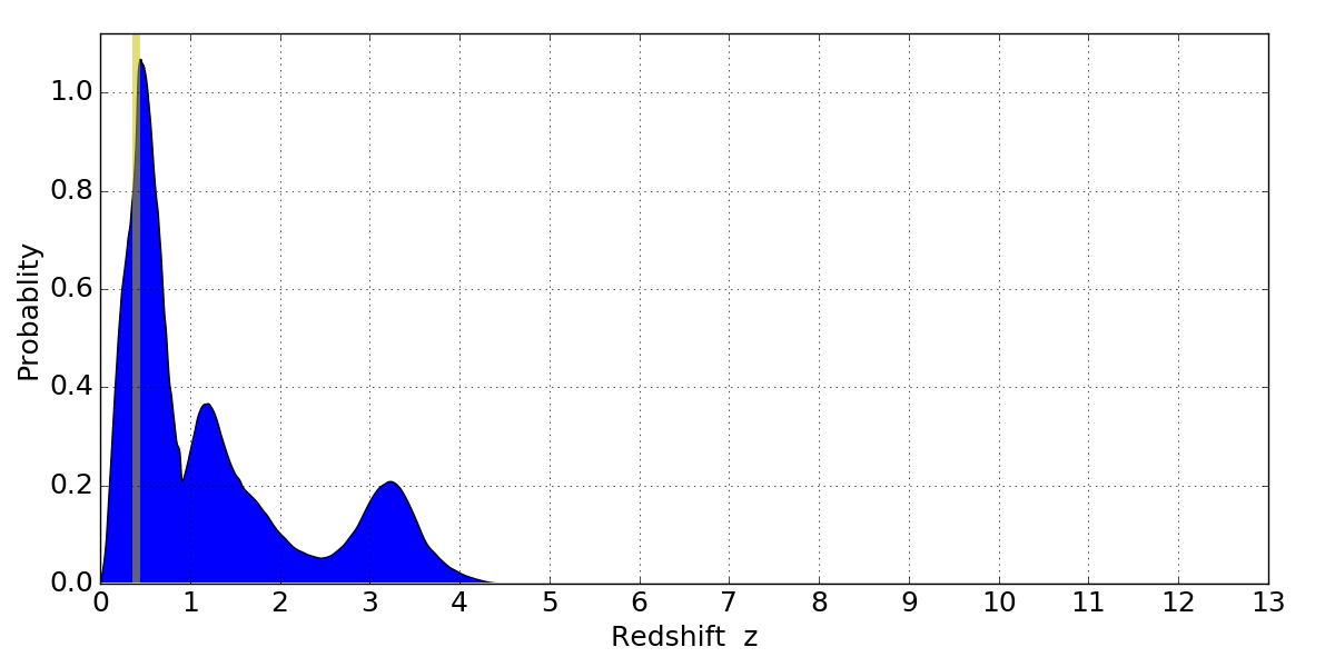 In P(z) plots: Yellow lines mark the cluster redshift z = 0.396,