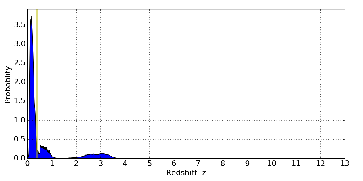 In P(z) plots: Yellow lines mark the cluster redshift z = 0.396,