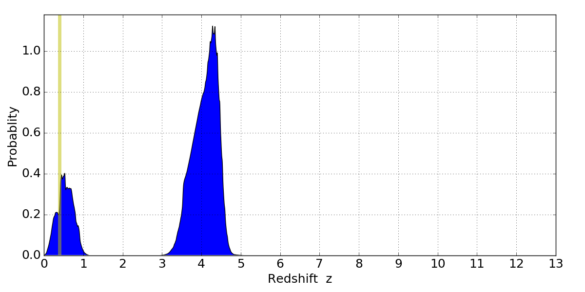 In P(z) plots: Yellow lines mark the cluster redshift z = 0.396,