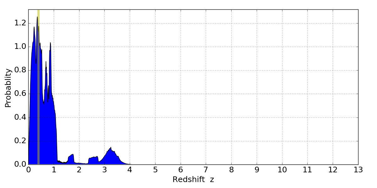 In P(z) plots: Yellow lines mark the cluster redshift z = 0.396,