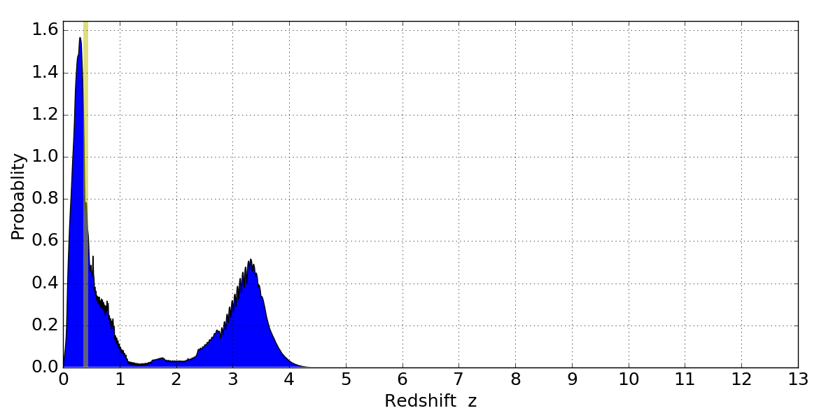 In P(z) plots: Yellow lines mark the cluster redshift z = 0.396,