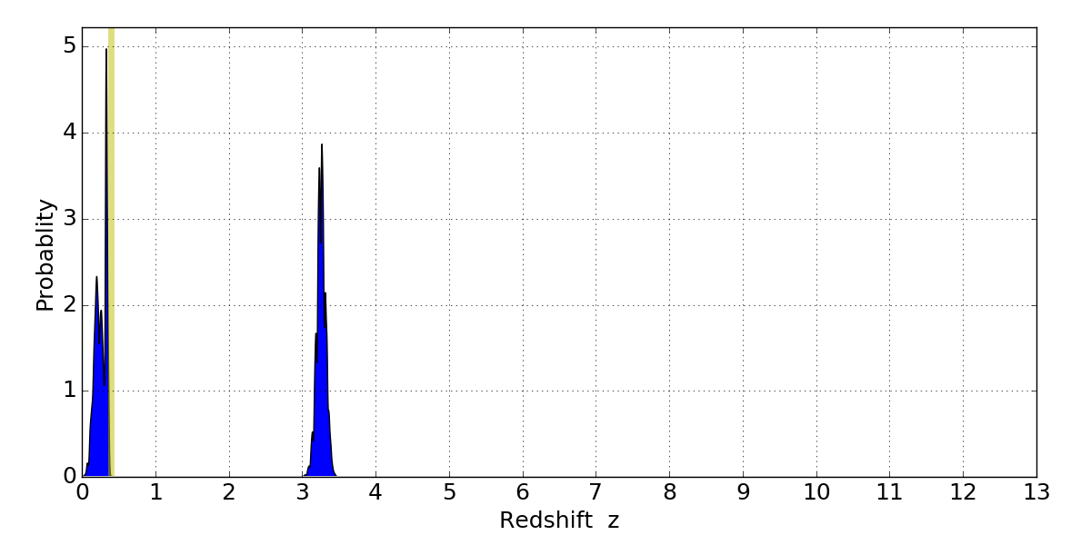 In P(z) plots: Yellow lines mark the cluster redshift z = 0.396,