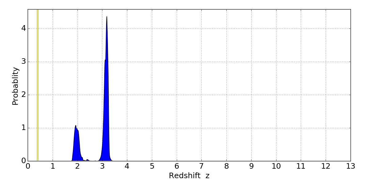 In P(z) plots: Yellow lines mark the cluster redshift z = 0.396,