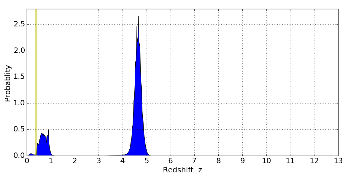 In P(z) plots: Yellow lines mark the cluster redshift z = 0.396,