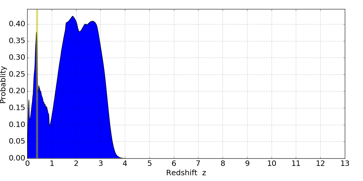 In P(z) plots: Yellow lines mark the cluster redshift z = 0.396,
