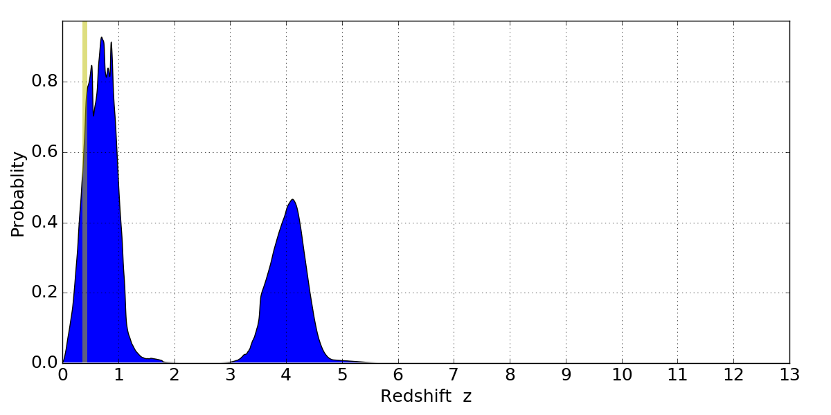 In P(z) plots: Yellow lines mark the cluster redshift z = 0.396,