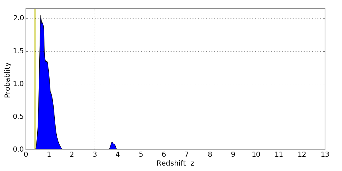 In P(z) plots: Yellow lines mark the cluster redshift z = 0.396,