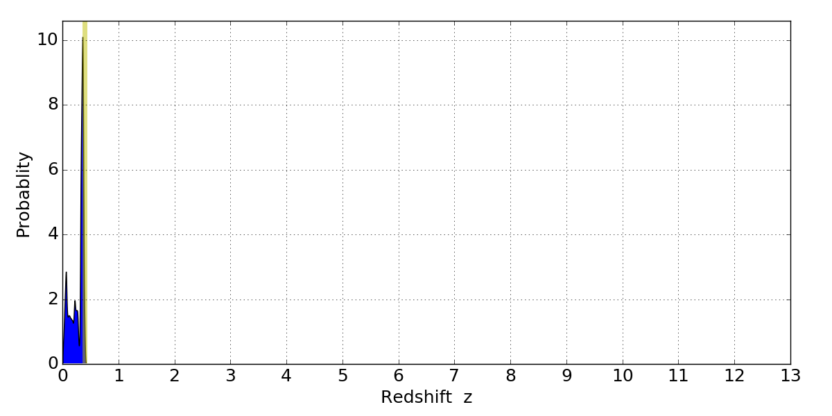 In P(z) plots: Yellow lines mark the cluster redshift z = 0.396,