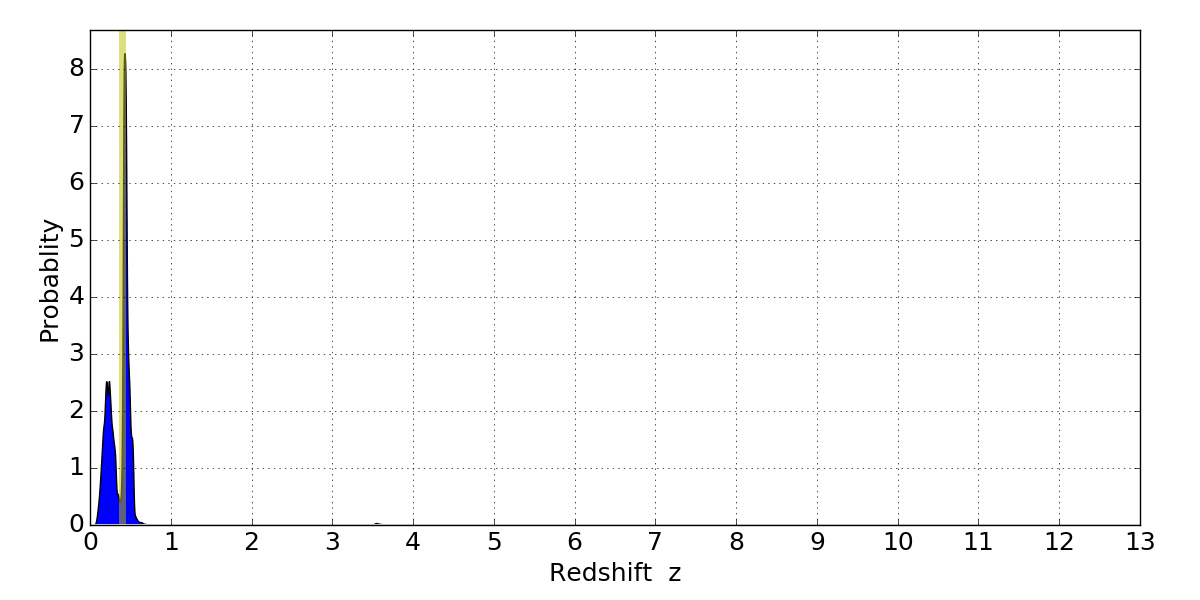 In P(z) plots: Yellow lines mark the cluster redshift z = 0.396,