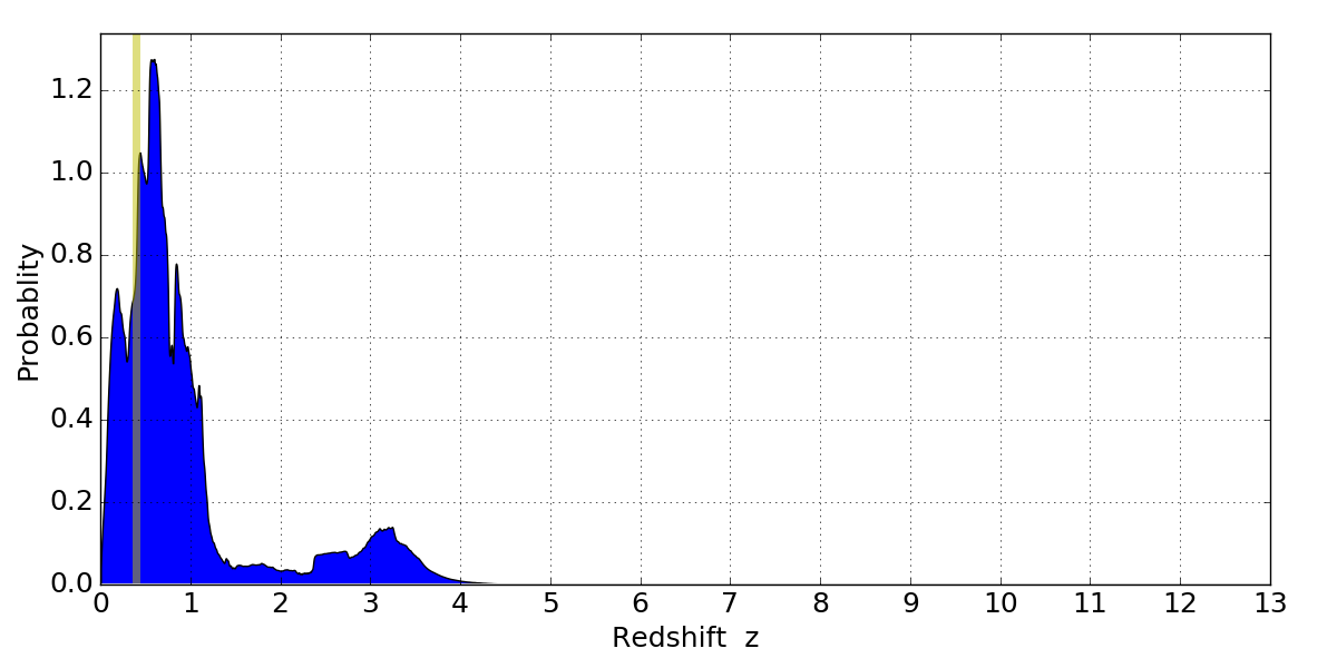 In P(z) plots: Yellow lines mark the cluster redshift z = 0.396,