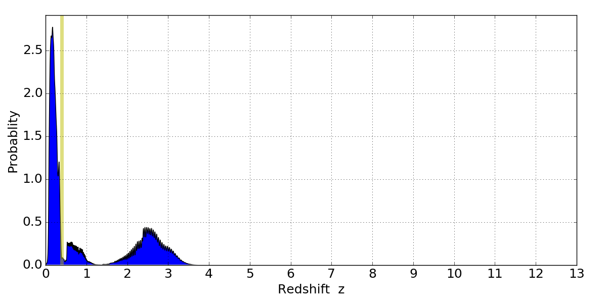 In P(z) plots: Yellow lines mark the cluster redshift z = 0.396,