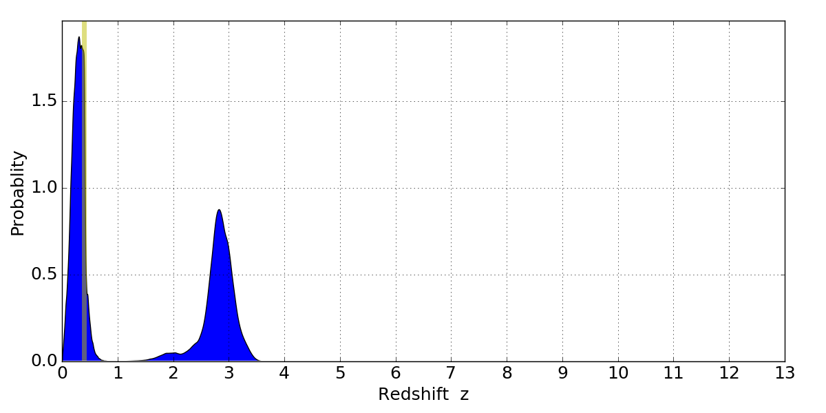 In P(z) plots: Yellow lines mark the cluster redshift z = 0.396,