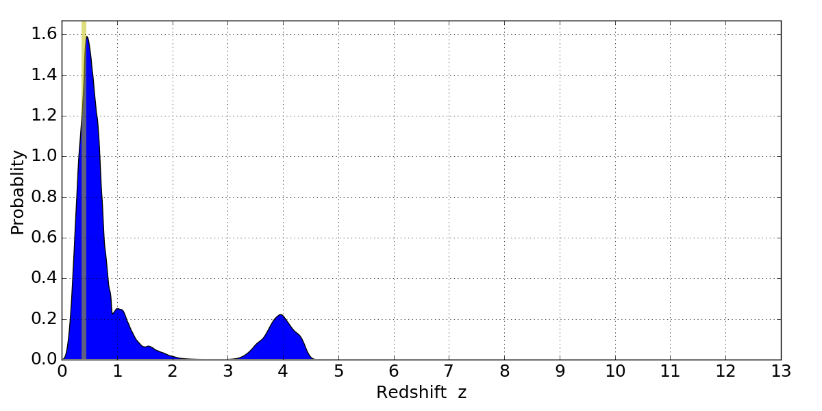 In P(z) plots: Yellow lines mark the cluster redshift z = 0.396,