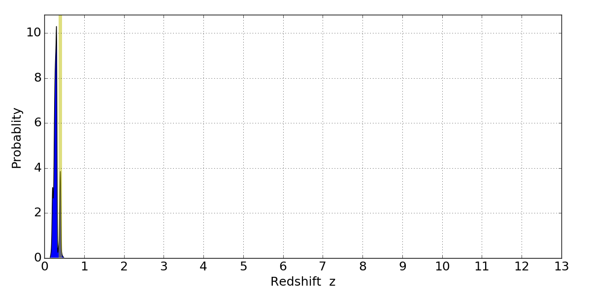 In P(z) plots: Yellow lines mark the cluster redshift z = 0.396,