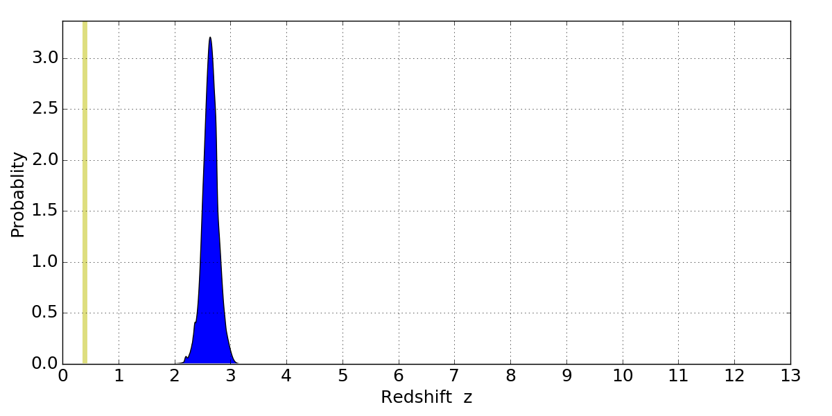 In P(z) plots: Yellow lines mark the cluster redshift z = 0.396,