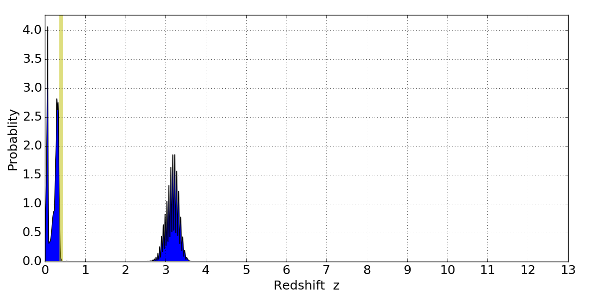 In P(z) plots: Yellow lines mark the cluster redshift z = 0.396,