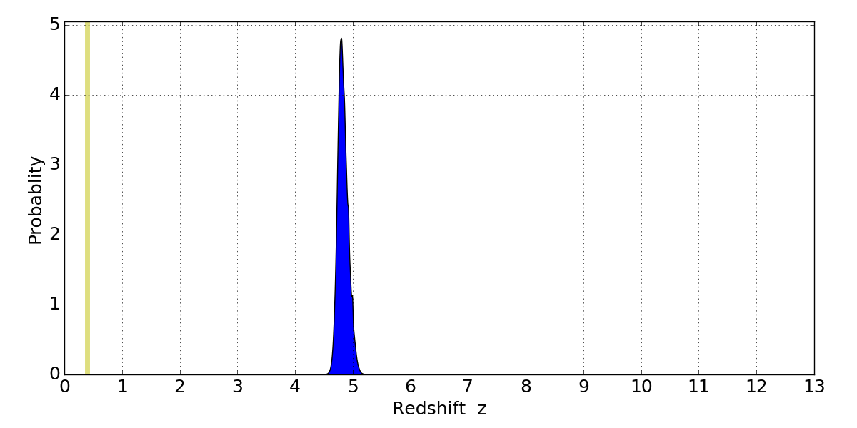 In P(z) plots: Yellow lines mark the cluster redshift z = 0.396,