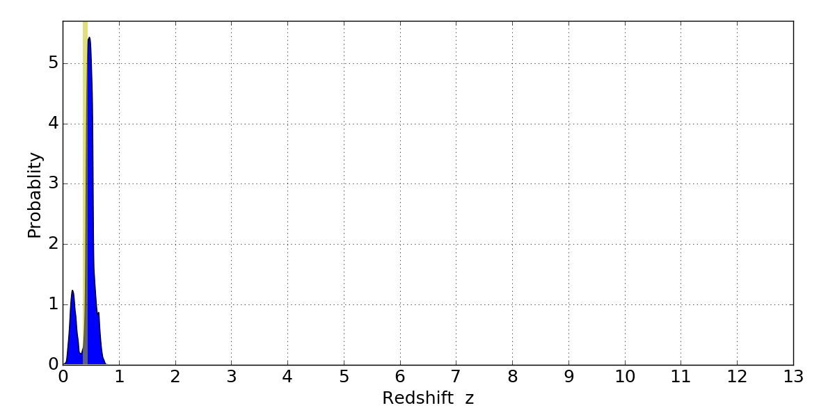 In P(z) plots: Yellow lines mark the cluster redshift z = 0.396,