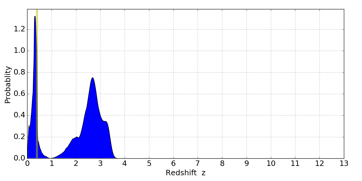 In P(z) plots: Yellow lines mark the cluster redshift z = 0.396,