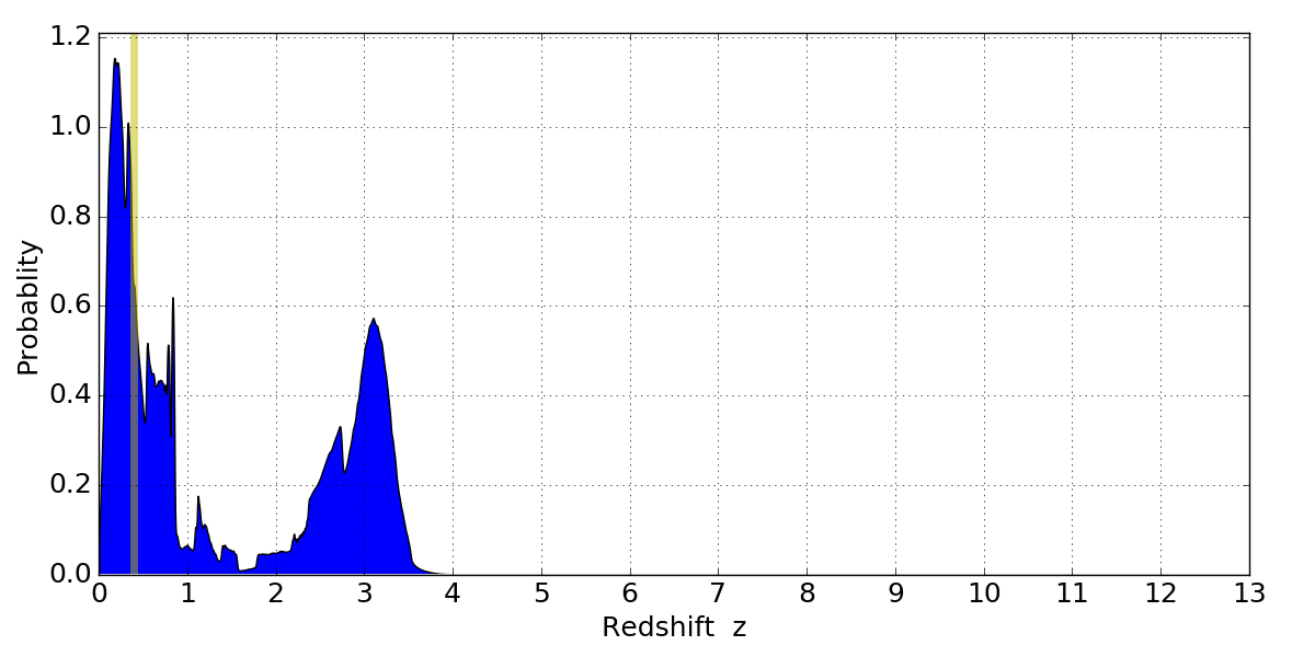In P(z) plots: Yellow lines mark the cluster redshift z = 0.396,