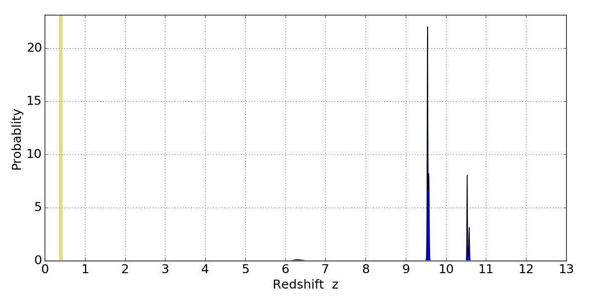 In P(z) plots: Yellow lines mark the cluster redshift z = 0.396,