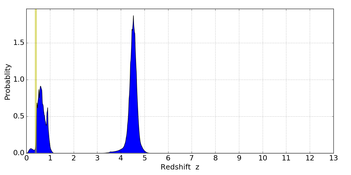 In P(z) plots: Yellow lines mark the cluster redshift z = 0.396,