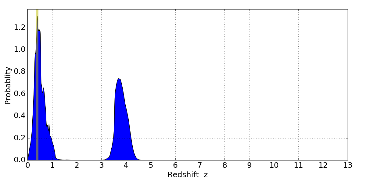 In P(z) plots: Yellow lines mark the cluster redshift z = 0.396,