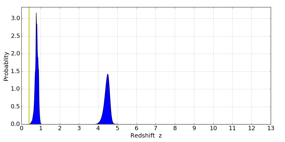 In P(z) plots: Yellow lines mark the cluster redshift z = 0.396,