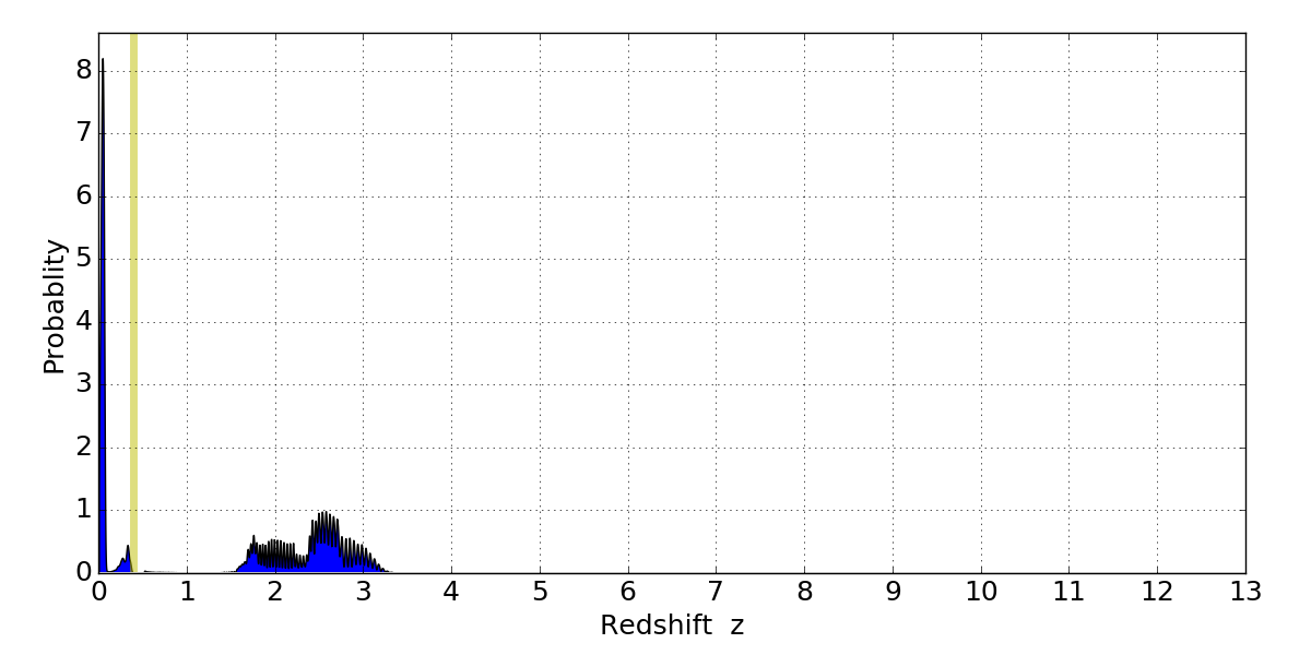 In P(z) plots: Yellow lines mark the cluster redshift z = 0.396,