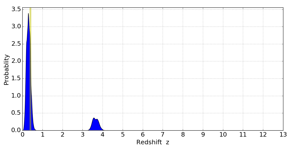 In P(z) plots: Yellow lines mark the cluster redshift z = 0.396,