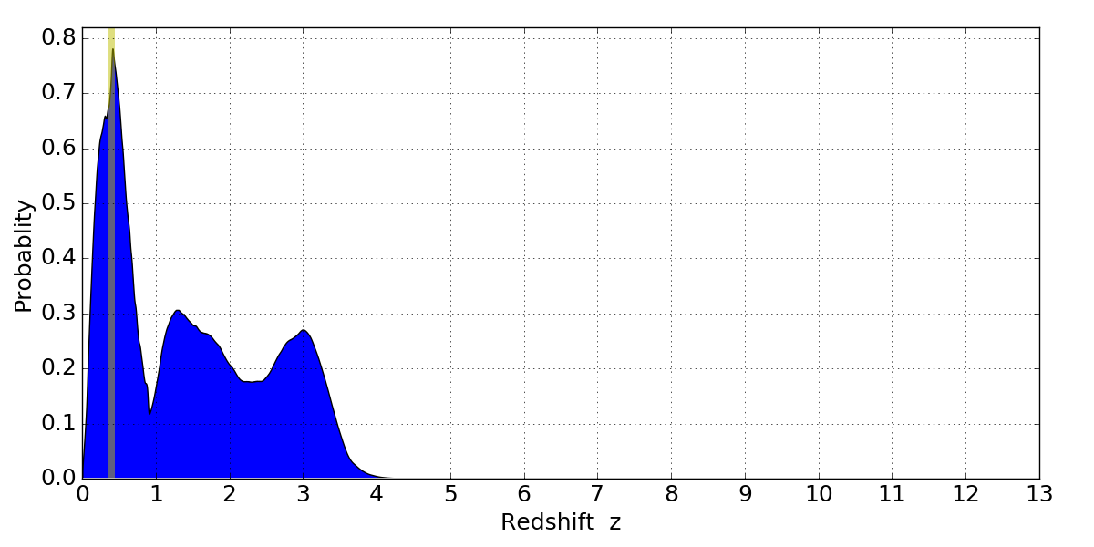 In P(z) plots: Yellow lines mark the cluster redshift z = 0.396,