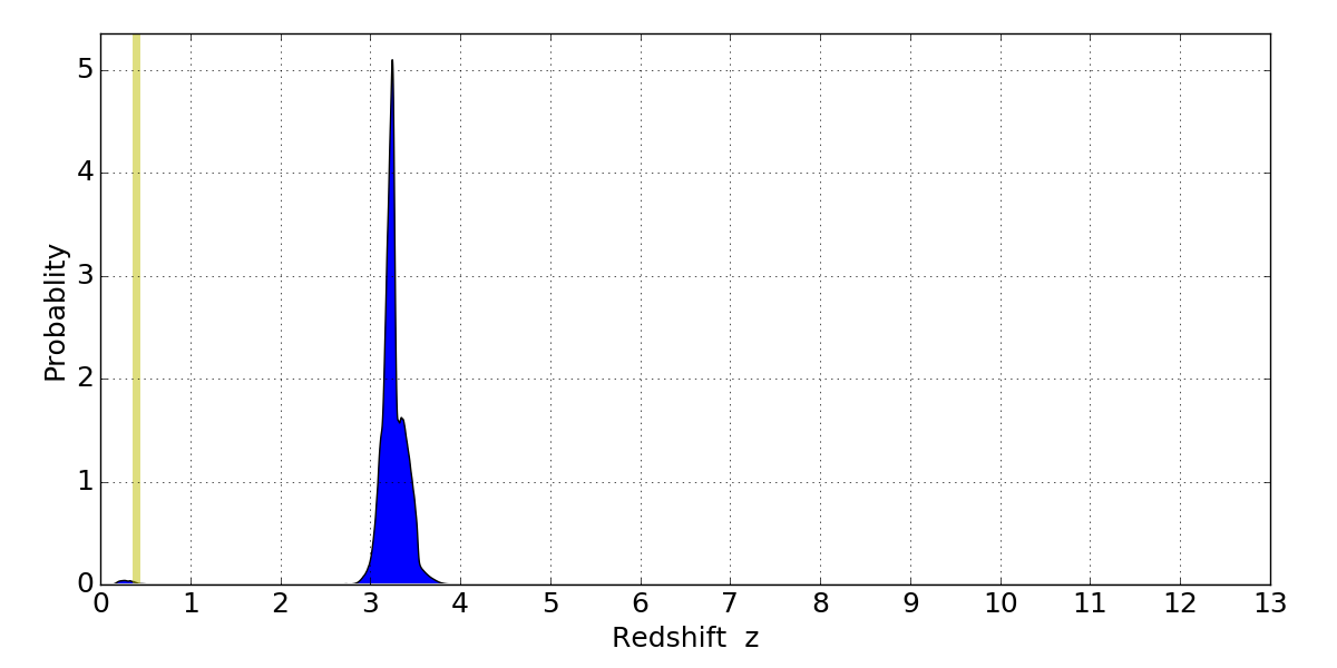 In P(z) plots: Yellow lines mark the cluster redshift z = 0.396,