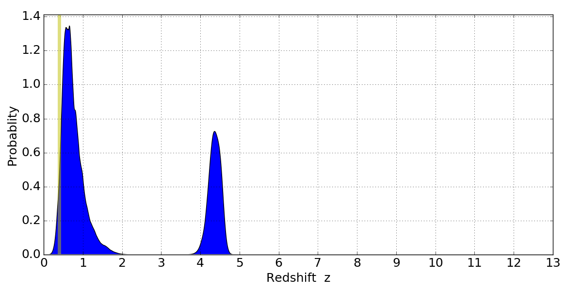 In P(z) plots: Yellow lines mark the cluster redshift z = 0.396,