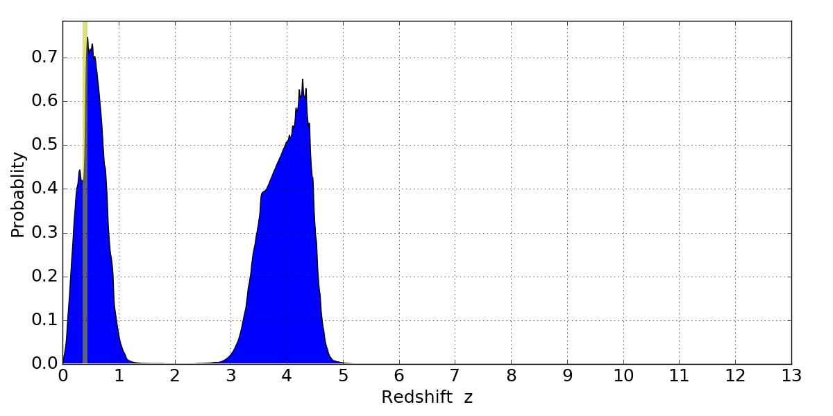In P(z) plots: Yellow lines mark the cluster redshift z = 0.396,
