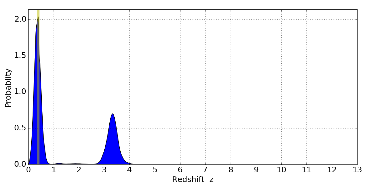 In P(z) plots: Yellow lines mark the cluster redshift z = 0.396,