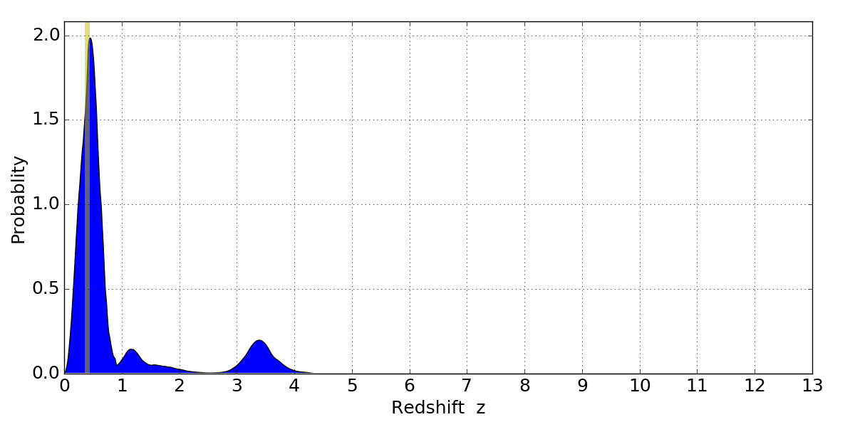 In P(z) plots: Yellow lines mark the cluster redshift z = 0.396,