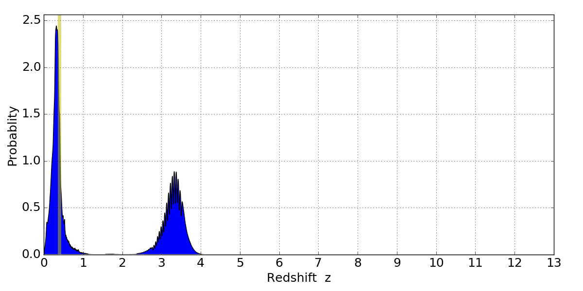 In P(z) plots: Yellow lines mark the cluster redshift z = 0.396,