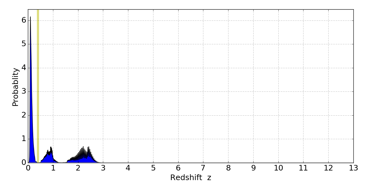 In P(z) plots: Yellow lines mark the cluster redshift z = 0.396,