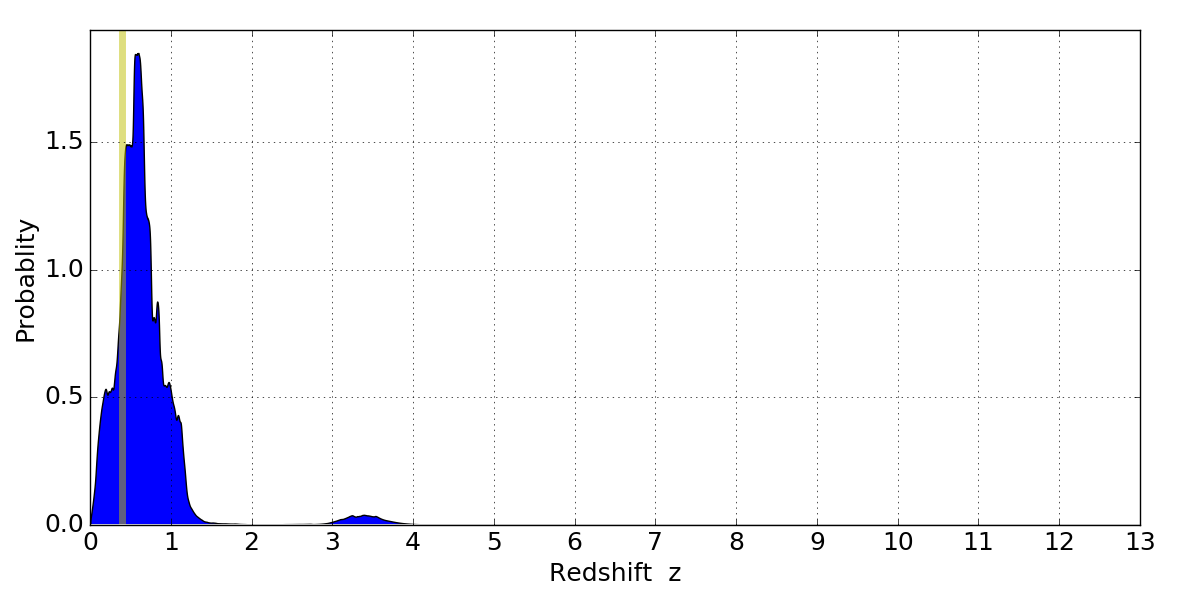 In P(z) plots: Yellow lines mark the cluster redshift z = 0.396,