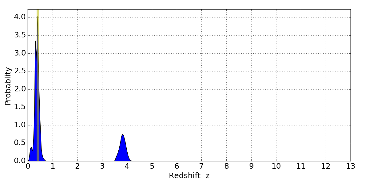 In P(z) plots: Yellow lines mark the cluster redshift z = 0.396,