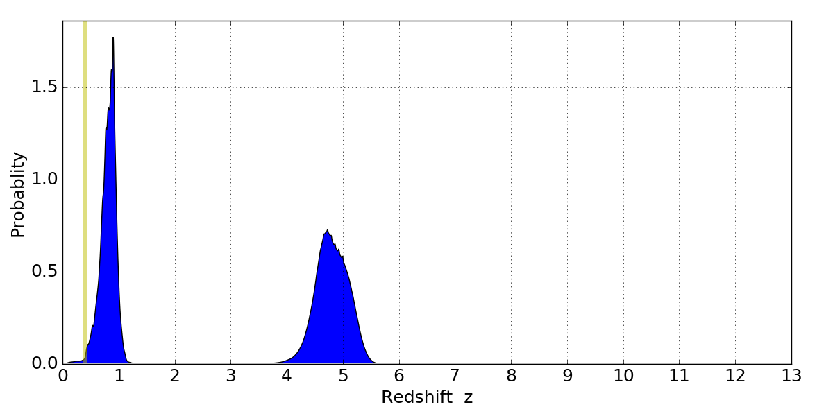 In P(z) plots: Yellow lines mark the cluster redshift z = 0.396,
