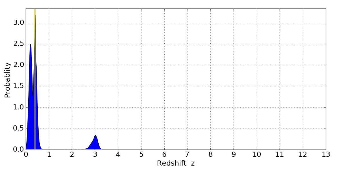 In P(z) plots: Yellow lines mark the cluster redshift z = 0.396,